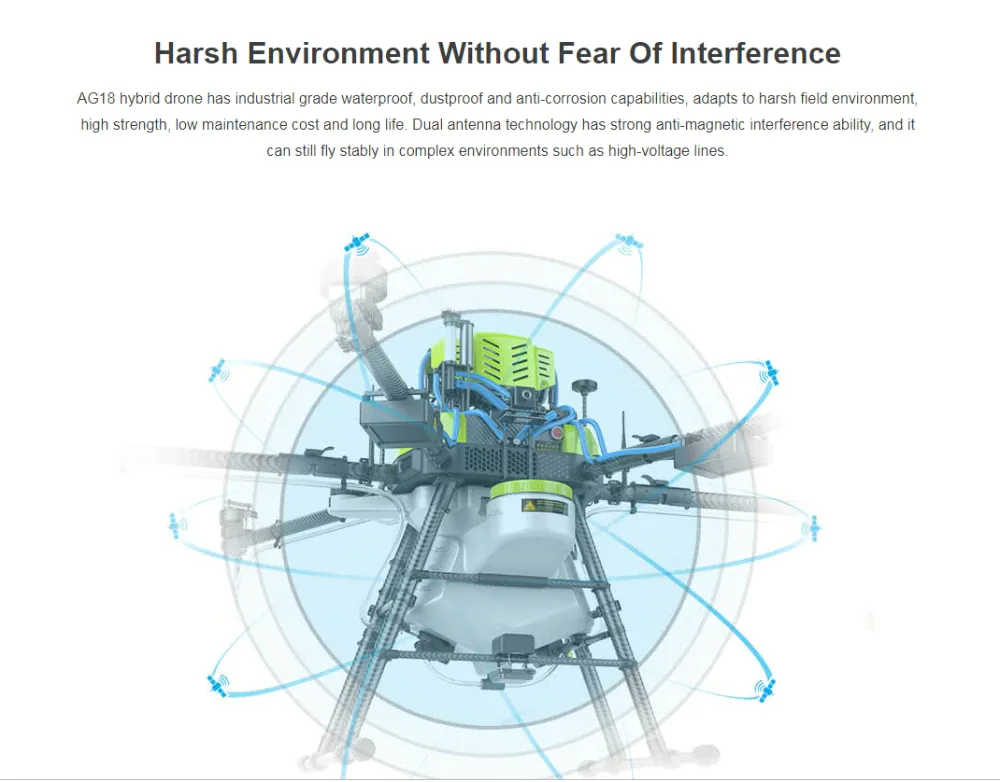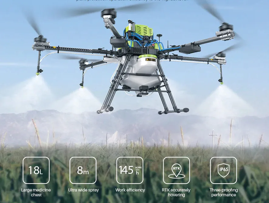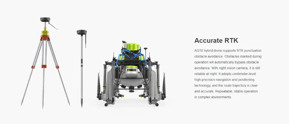 | Дополнительные возможности | Пульт со встроенным дисплеем 7.86-дюйма разрешением 2048× 1536; яркость 2000 cd/m2 / Двухтактный бензогенератор 7.5KW с водяным охлаждением / Поддержка сверхточного позиционирования RTK / Емкость распылителя 18 литров |