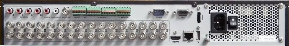 | Порты и интерфейсы | 1 × HDMI / 1 × VGA / 32 × BNC / 1 × RCA Audio Out / 4 × RCA Audio In / 1 × RCA Two-way Audio / 3 × USB 2.0 / 4 × SATA / 1 × eSATA / 1 × RJ-45 / 1 × RS-485 / 1 × RS-232 |