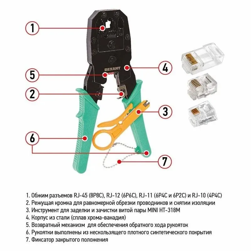 | Обжим | RJ-45 (8P8C), RJ-12 (6P6C), RJ-11 (6P4C и 6P2C) и RJ-10 (4P4C) |