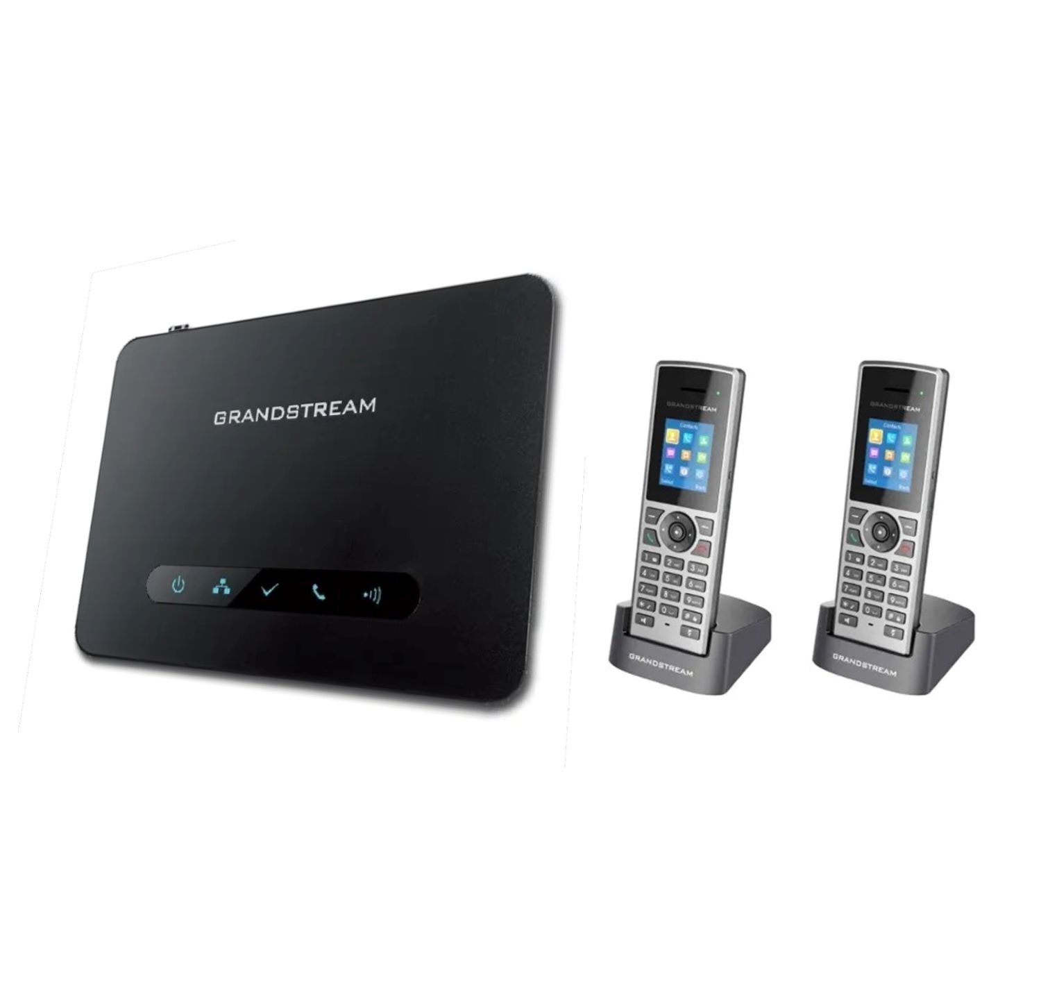 Grandstream DP750/2DP722 – это комплект из базовой станции Grandstream DP750 и двух DECT телефонов DP722. Подойдет как бюджетное решение для организации цифровой телефонии для малых предприятий (аптеки, склады, мастерские), а также в многоуровневых квартирах или домах. Вы сможете создать беспроводную мини-АТС с добавочными номерами. При этом внутри сети вы будете общаться бесплатно.